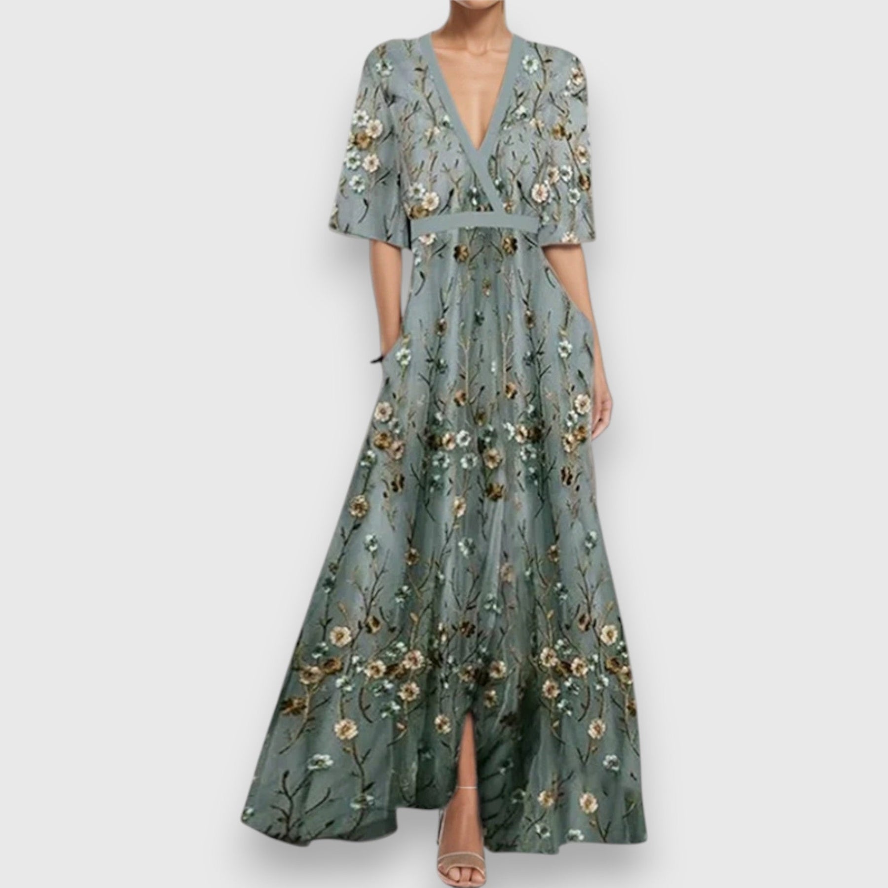 Damen-Maxikleid mit Blumenmuster – tiefer V-Ausschnitt
